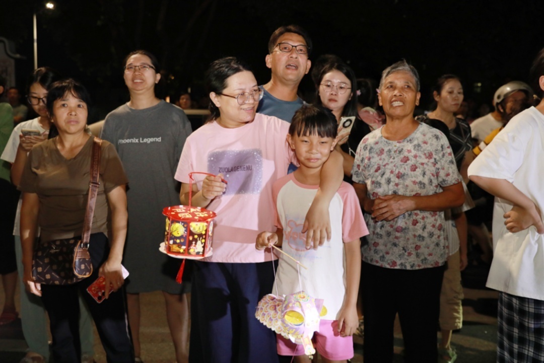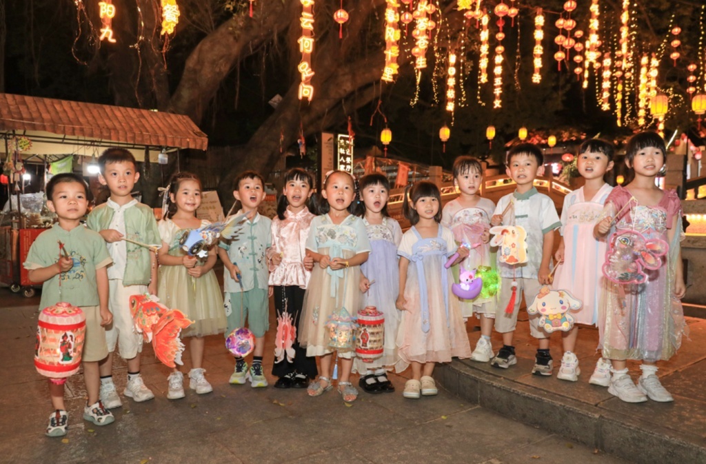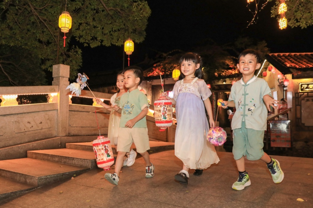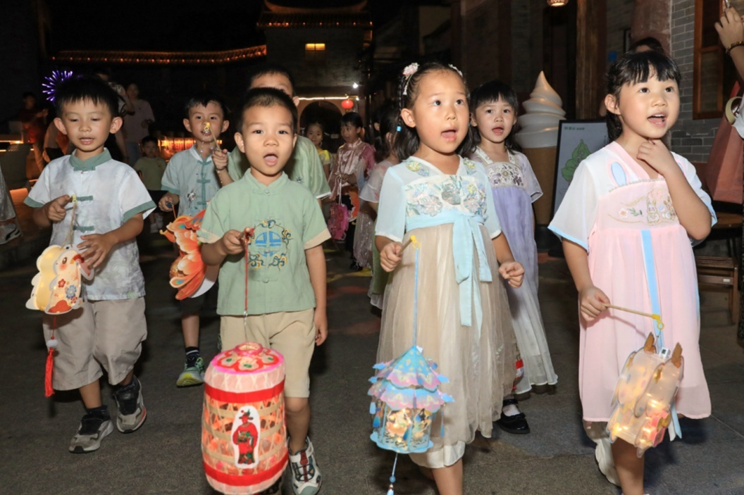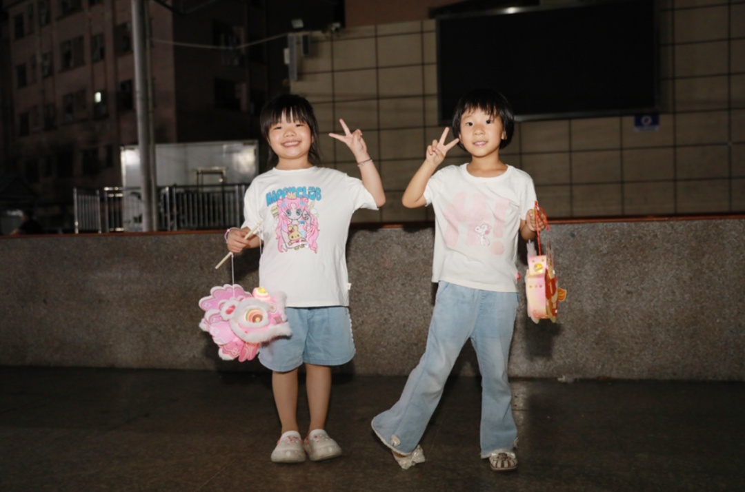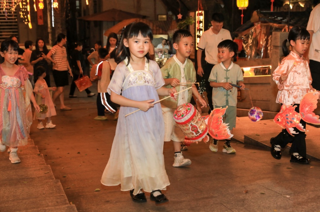 △现场,孩子们还带着各式各样的灯笼走街串巷,庆祝中秋