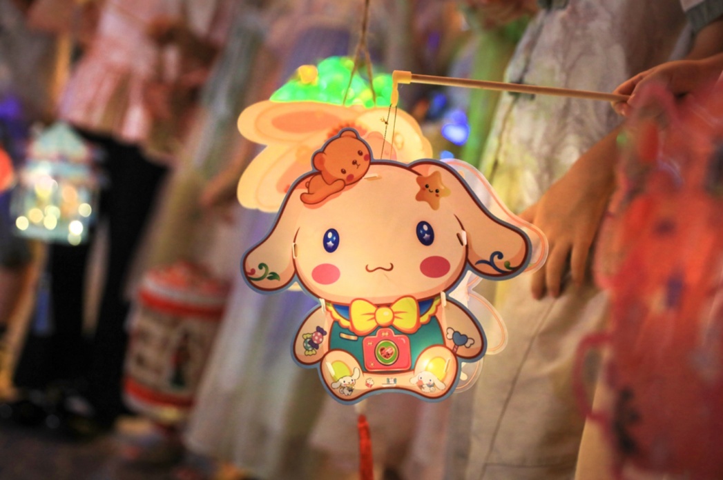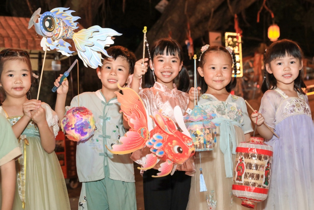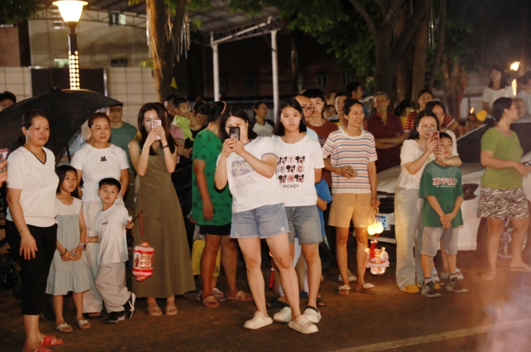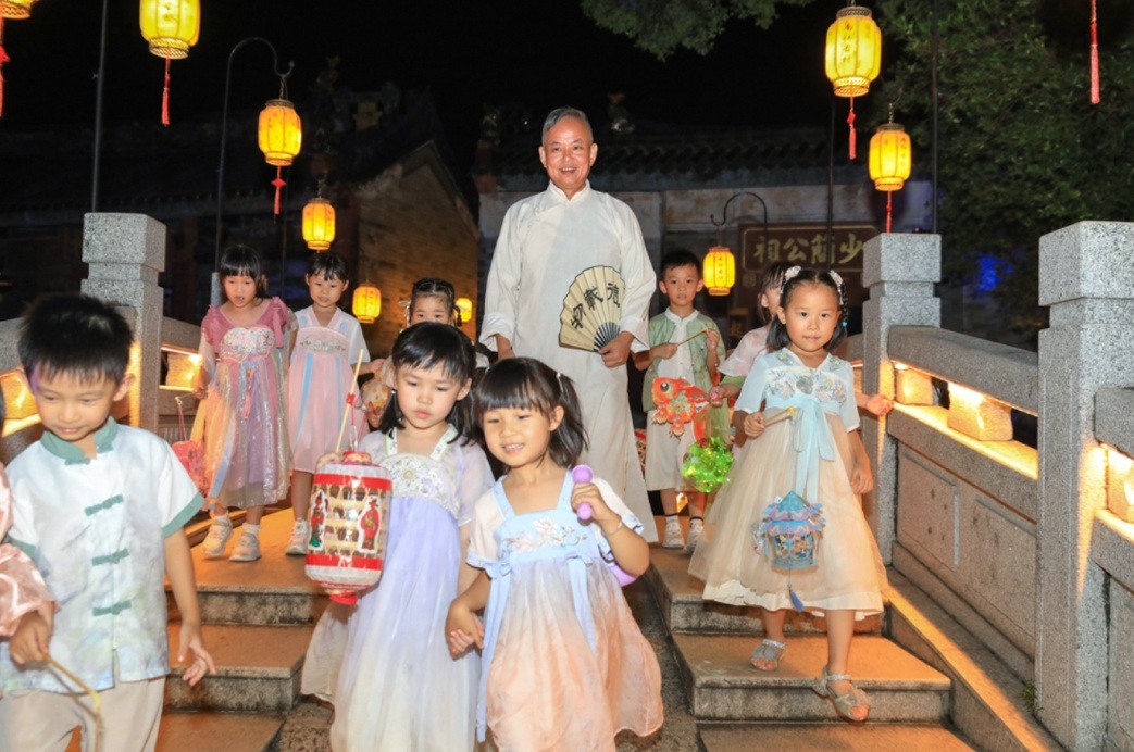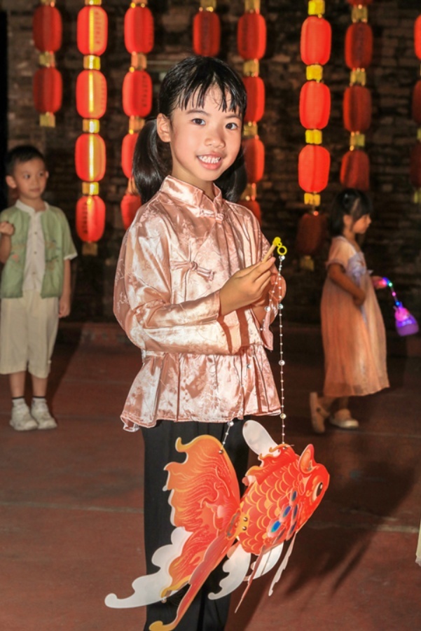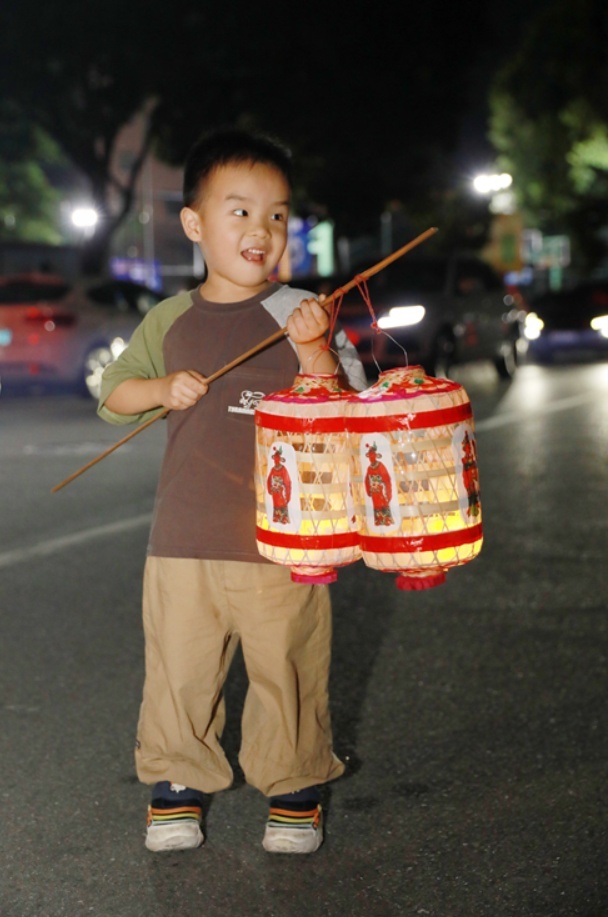 △现场,孩子们还带着各式各样的灯笼走街串巷,庆祝中秋