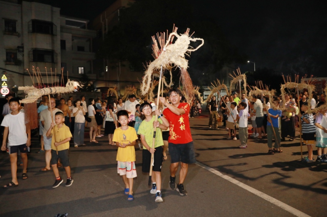 △小村民刘展衔(左)举着自家制作的草龙,跟着队伍一起巡游