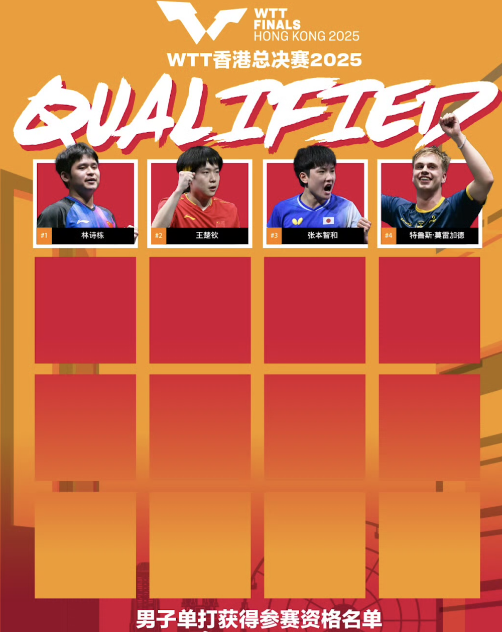 男单方面,林诗栋和王楚钦、日本选手张本智和、瑞典选手特鲁斯·莫雷加德入围。首批获得女单参赛资格的运动员是中国队的孙颖莎、蒯曼、陈幸同及中国澳门队的朱雨玲。混双项目上,首批获得参赛资格的是中国队组合林诗栋/蒯曼、韩国组合林钟勋/申裕斌。