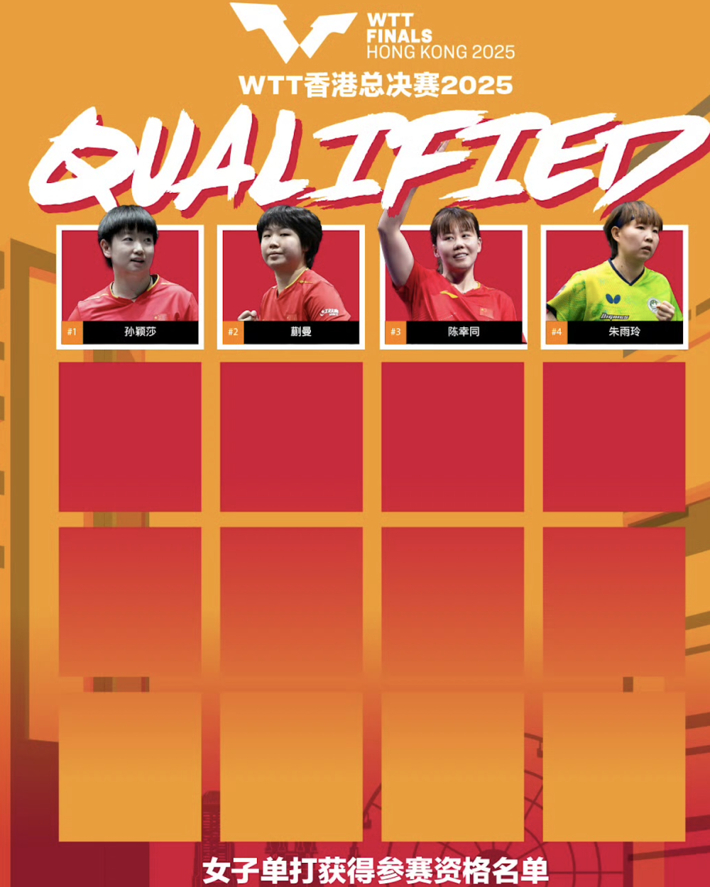 中国队孙颖莎、蒯曼、陈幸同及中国澳门队的朱雨玲获得WTT香港总决赛女子单打参赛资格。图片来自WTT世界乒联官方微博